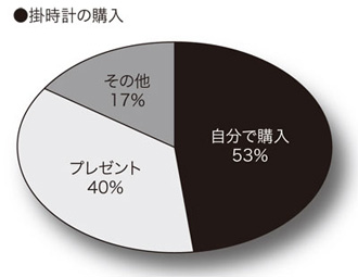 その[掛時計をどのように手にして手に入れたか]に関しては、自分で購入が53%、プ レゼントされたが40%、その他17%となっている。この比率は、腕時計とは違うことは明らかだろう。掛・置時計は、新築・転居などの際の祝い品としての需要が大きな役割を果たした時期があった。それ以外にも掛時計が贈答品としてのポジションを持っていることは、改めてこのアンケートの結果が証明しているといえよう。