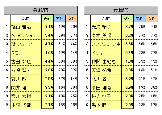 男性部門は、昨年に続き俳優の福山雅治さんが1位に輝きました。テレビドラマなどでメガネ姿を披露したことはあるものの、常にメガネを掛けているわけではない福山さん。にもかかわらず2年連続1位という結果になったのは、大河ドラマ『龍馬伝』での露出も影響しているのでしょうか。続く第2位は、毎年上位に名を連ねている韓国俳優のぺ・ヨンジュンさん。なんと7年連続、1位または2位に選ばれており、もはや殿堂入りの貫禄さえあります。3位以下は混戦を極めましたが、毎年ランキング常連であるタレントの所ジョージさんが、初のトップ3入りを果たしました。