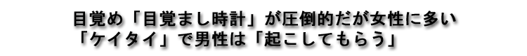 「自然に」は、なかなか厳しいのか男16%・女20%。「目覚まし時計」が当然ながら圧倒的で男42%・女47%と半数近くになる。 男女に違いがあるのが、「携帯電話」男15%・女31%と「人に起こしてもらう」男17%・女2%。そろそろ起きないと遅れるわよと家族に布団を剥がされされる光景が浮かぶ。「携帯電話と目覚まし時計」は男25%・女19%。