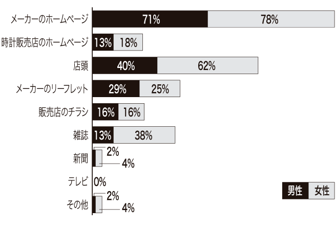 ■新聞 注目度は極めて低い? 一時ほどではないにしても、日刊紙にはほぼ連日のように時計の広告が掲載されている。しかし今回のアンケートでは、 そこに情報を求めるとした回答は男性2%、女性4%だった。ここで見る限り、新聞広告の存在感は極めて低いといえる。