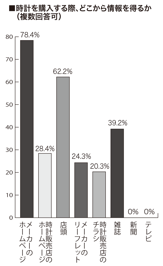 最も多くあがったのは<メーカーのホームページ>で78.4%、次いで<店頭>が62.2%、<雑誌>が39.2%。<時計販売店のホームページ>28.4%、<メーカーのリーフレット>24.3%、<販売店のチラシ>20.3%と続き、今回の調査では<新聞><テレビ>はゼロ%だった。