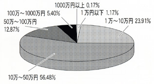 輸入時計の販売状況を価格帯別に見てみると、グラフのとおりになっています。販売数量は、「10万円から50万円」の価格帯の割合が56%を占めており、「1万円以下」の動きは極端に鈍くなっています。