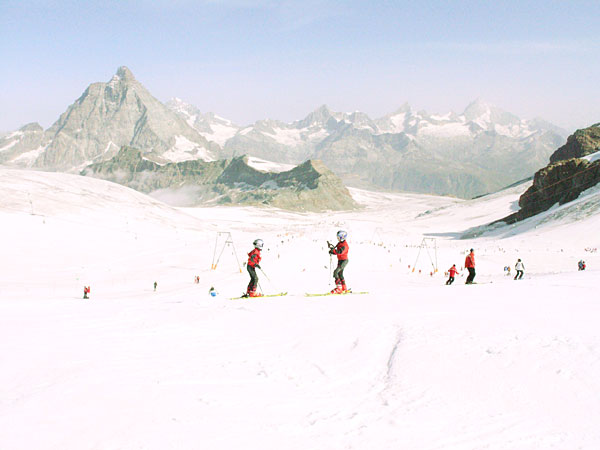 Matterhorn)の岩峰です。その岩峰の最上部分の岩の中をくりぬいて駅を作り、そこがツェルマットの街から上がってくるケーブルの終点駅になっています。岩峰の左側に見える白い突起がケーブルカーの出入口です。岩峰の手前の正面からスキーのコースが、こっちへ向かって下って来ています。そこを滑り降りて、このスキー場の真ん中あたりの斜面へ出て、さらに滑り下りてスキー場の下の端からTバー・リフトに乗ってここへ上がってくるわけです。写真の右上の鉄塔の後ろ側に頂上部分がお団子みたいな形の白い丸い山が見えますね。ブライトホルン(Breithorn)標高4165メートルです。安全に登れる雪山で誰でもクライン・マッターホルン駅まではケーブルで上がれますから、世界でイチバン登りやすい4000メートル級の山として人気が高いです。真夏にこんな氷河の広々した白い斜面で滑りまくるのは、それは気分の良いものですよ。2年間の完全なブランクの後の「アルプスへの復帰」になりました。