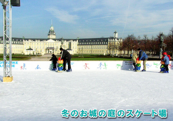 フランクフルトの南のライン河畔の街カールスルーエの中心にあるお城の庭に仮設されたスケート場です。