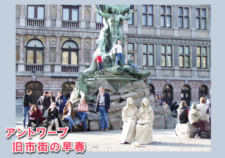 アントワープの中心もマルクト広場。磨り減った石畳が床の広場です。中心には歴史的な像と噴水があります。いつも大勢の街の人びとや旅人の憩いや遊びの空間です。白衣の二人は大道芸人。