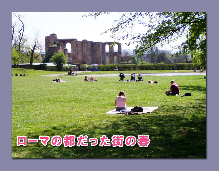 前方にローマの遺跡が見えますね。ここはモーゼル河畔のドイツ。ローマ時代には西ローマ帝国の首都でした。ローマの皇帝たちが住んでいました。今は大学生の多い街です。学校の昼休にハダをだした男女の学生たちが青春を謳歌していました。