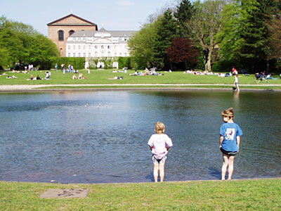 | 宮廷公園の芝の上に、大学生のおねいさんたちが、ねころんで、本を読んだりしています。チョット、まだ、水は冷たいんだけど、ボクたちは、子供らしく、新しいアドヴェンチュアへ挑戦しようとしています。けど、やっぱり、まだ、まだ、水は冷たすぎるかな?前に見えるお館のスグ先には街の中心の広場や教会があります。 |
