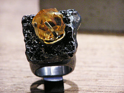 | 上の写真はお店の裏の中庭からお店を撮りました。中央のガラスの前が店です。デザインも制作も販売も、なにもかも、ふたりで、やっています。立っているのは彼です。彼女も彼も世界中にファンを持つデザイナーです。下の写真は彼の作品です。シトリン原石をセットしたシルバーのリングです。値段がスゴク安いんです。 |