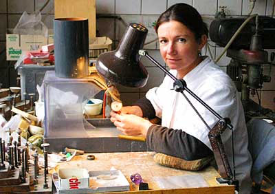 | そのデザイナーさんです。まだ、若いですが、経験豊富な実力者です。父と母と彼女と5人の女性の職人で、彼女が経営する工房を動かしています。彼女は3代目の経営者です。彼女の夫は大企業のサラリーマンです。小規模ながら、巨大な原石のままの原石を完全に加工できる能力を持った世界最強の工房の若主人です。 |