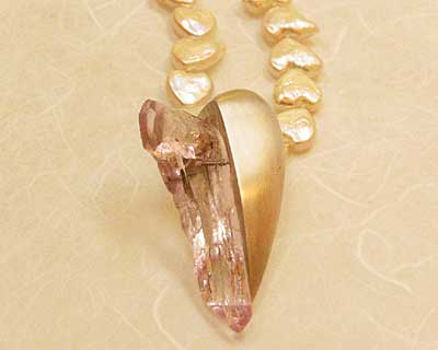 | 写真の彼女の作品なんですが、クンツァイトの原石を、アッサリと使いこなしています。オサナさじゃなくて、若々しいモダンさを感じさせられます。ハツラツとして、やわらかい、若者らしい感性から生まれた作品ですね。これから新宝石が大衆化するプロセスでは彼女の自然で単純明快な庶民性が役たちますね。 |