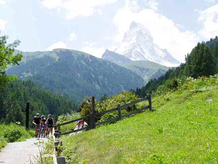 頭上には前夜に降り積もった新雪に輝くマッターホルンの北壁。 |