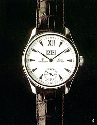 2000年を境こブームを呼んだ大きなデイトを顔に持ったリストウオッチ。そのカテゴリーの中でも破格のプライスを実現したのが、この天賞堂グランドデイト。破格とはいえ製造工程に妥協が許されているわけではない。ムーブメントには、多くの高級時計メーカーがベースにする機械式ムーブメント・ユニタスにコート・ド・ジュネーブを施し、スイスの伝統的なクラシックタイプのデザインで仕上げたケースに収められている。文字盤は、12時以外はバーインデックス、針もリーフスタイルのブルースティールを使用するなど通好みの仕上がり。全面クリスタルガラスを使用したシースルーバックも魅力だ。18万9000円。