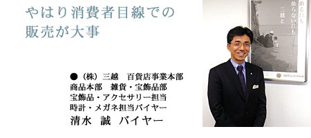 日本最大手といえる百貨店、(株)三越の時計・メガネを担当するバイヤー、清水誠さんに話を聞いた。「最近のバーゼルフェアやSIHHについて感じることは、技術革新や素材、こだわりの追及などもあって新製品の価格が全体的に高くなりつつありますよね。勿論プレステージ性も大切ですが、今までの“買いやすい商品”までもが高くなると、現状の販売本数減少傾向などもありマーケット全体に不安を感じます」と時計の全体的な価格上昇を懸念していた。「どのラインが“買いやすい商品”かは消費者により違いはありますが、この価格帯に話題性が増せばもう少し時計業界の流れも良い方向に向かうのではないでしょうか」と価格帯の戦略に疑問を投げかけていた。また「気になる流れとして、メンテナンス・フリーの開発や異素材の使用に大手企業が取り組んでいることは、将来的に大きな可能性に繋がると思うし、消費者寄りのモノ作りとして期待できることのひとつだと思います」と新しい時計業界の流れにも目を向けている。「三越の時計売場は、今年度全店計で昨対比7%増をキープしていますが、常に売場に動きが必要で立ち止まっているとすぐにマイナスに転じます。また、ただ売るだけでなく、トータル的な販売を行い、安心感を持っていただくことが大切で、時計のメンテナンスも大切なことのひとつです」と消費者信頼を強調。「時計業界が新たな領域に入っていく中で多くの“時計愛好者”の見る目も更に厳しくなりました。これからもいかに時計文化の楽しさ、おもしろさを伝えていくかを考えています」と消費者目線での考えを重要とした。