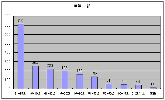 回答は、全国47都道府県全てからあり、男性が60%、女性が40%、年齢では21歳〜35歳を中心に10代〜60歳以上まで、職業も会社員はじめ、学生、主婦、自営業、公務員、自由業、フリーター、さらに定年退職者から無職の方まで幅広い方達から寄せられました。