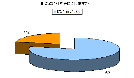ウオッチについては、「普段、時計を身につけている」人が78%。2割はつけていないことになります。「携帯電話で時計代わり」が目につきますが、「時計をしているとパソコンがしにくい」という人もいるようです。それでも「ウオッチに気をつかっていない人をみると、仕事ができそうにない」「携帯で時間を確認するが、やっぱり時計が必要だと感じることが多い」といった声もありました。